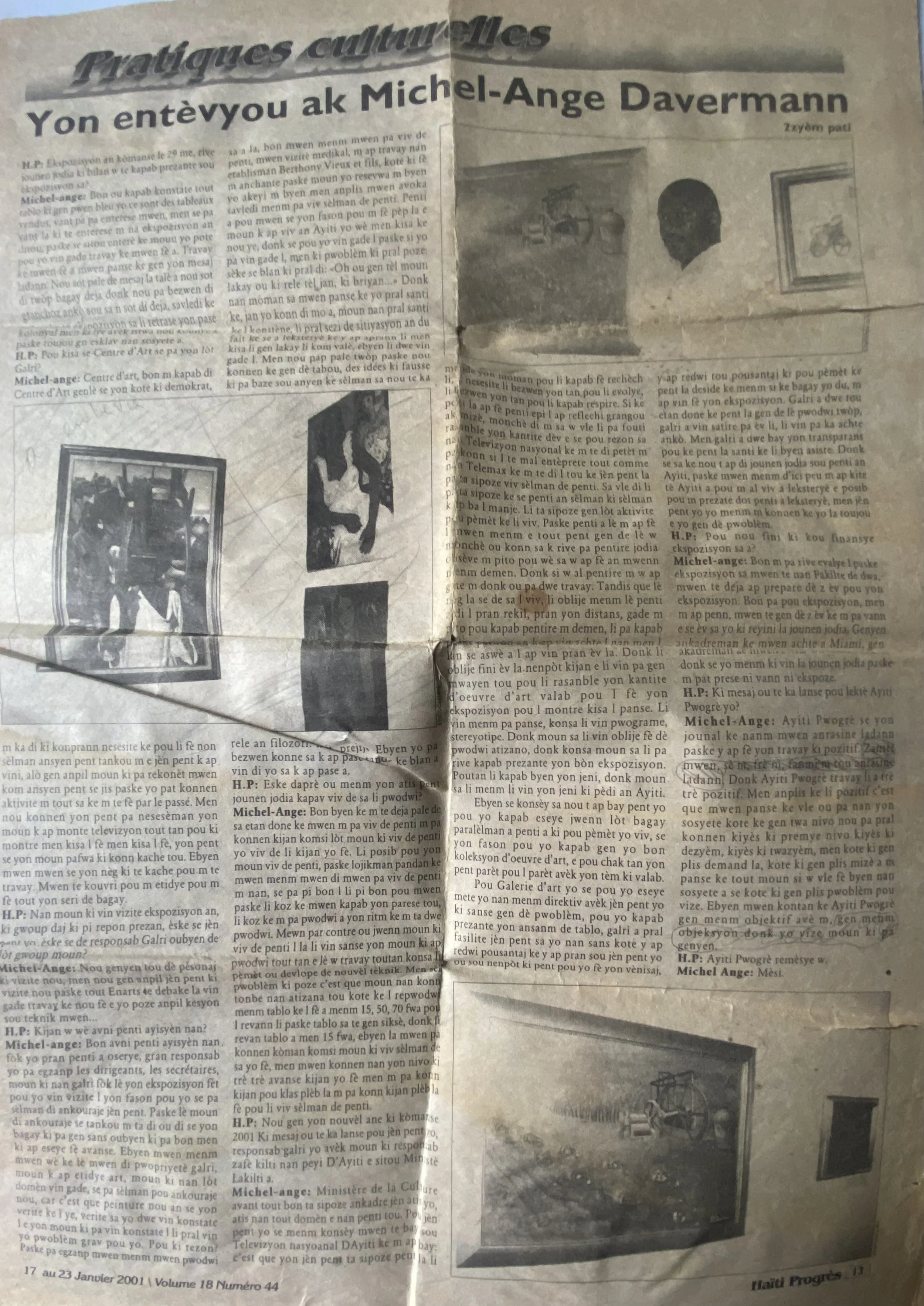 Michel Ange Davermann in the Media Mar 12 Written By Michel Ange Davermann A special interview conducted by Michel Ange Davermann with Haiti Progrés Newspaper in January 2001, at the occasion of his 2001 Exhibition “Les Ombres de L’Histoire” - Le Centre d’Art gallery. Michel Ange Davermann